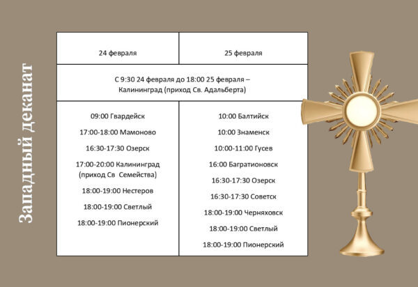 В связи с этим каждая Епархия взяла на себя обязанность организовать Поклонение и молитву перед Святыми Дарами в этих интенциях. Открывает этот цикл непрерывного Поклонения Архиепархия Божией Матери в Москве. Пресвятые Дары будут выставлены в часовне в крипте Кафедрального собора Непорочного Зачатия Пресвятой Девы Марии с утра 18 февраля и до вечера 19 февраля. Затем молитвенную инициативу подхватят приходы Южного деканата (20-21 февраля), Восточного (22-23 февраля), Западного (24-25 февраля), а завершится Поклонение в приходах Северо-Западного деканата 26-27 февраля.